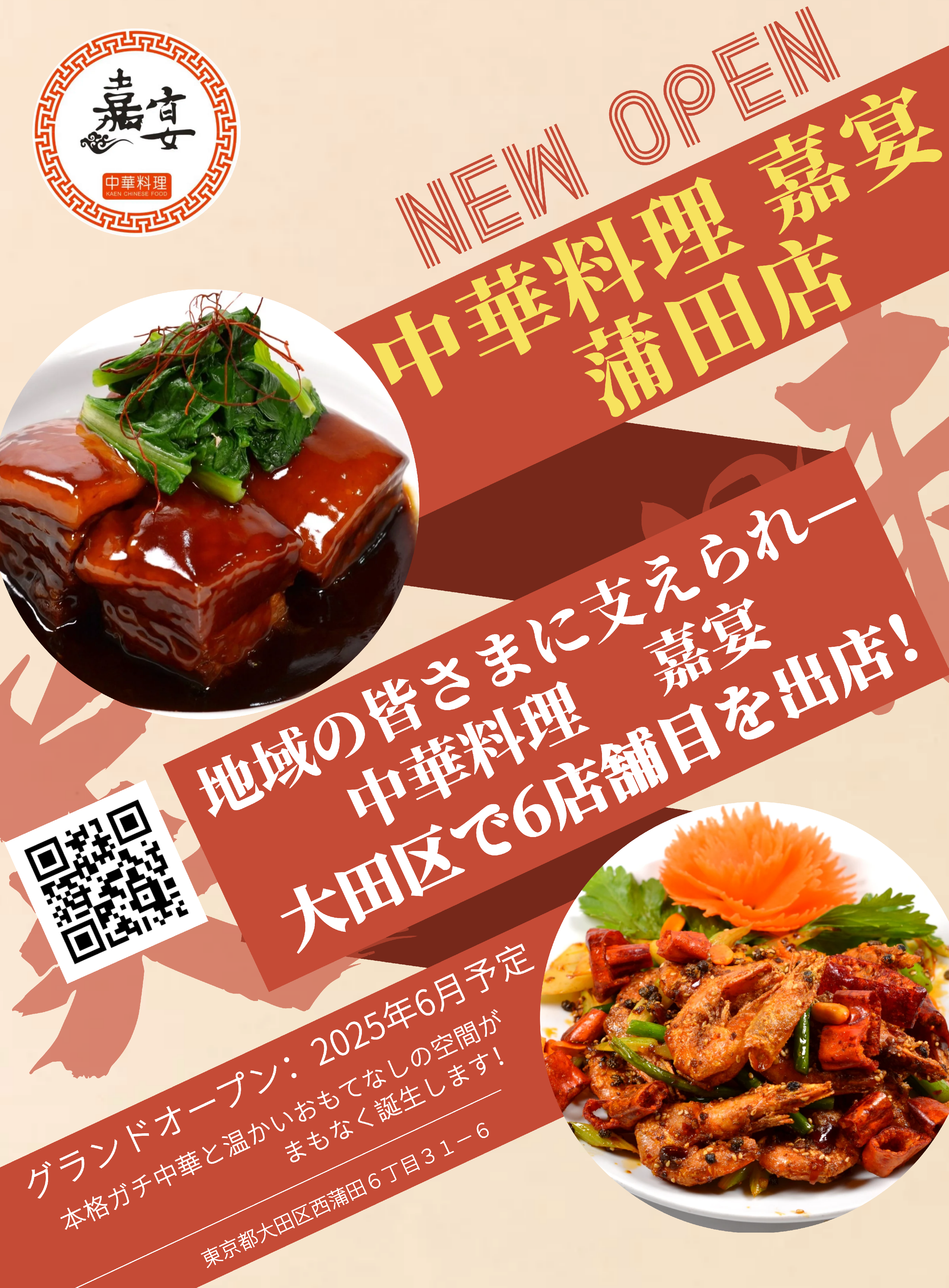 2025.04.18 【速報】蒲田に6店舗目オープン決定! 地域の皆さまに支えられ、大田区で展開中の中華料理《中華料理 嘉宴》。 このたび 6店舗目となる『蒲田店』が6月にオープン予定です! オープンキャンペーンも予定してます! お得な内容をただいま準備中ですので、どうぞお楽しみに♪